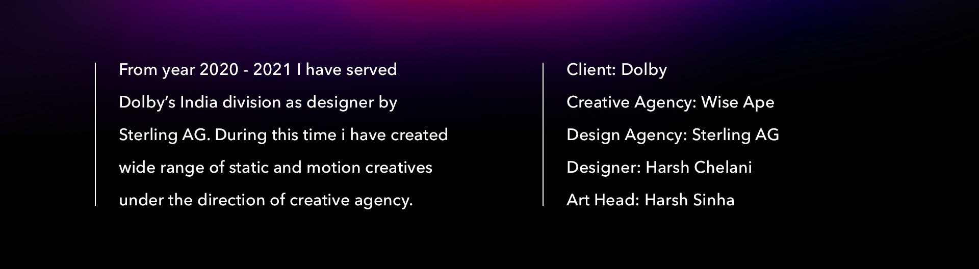 From year 2020 - 2021 I have served Dolby’s India division as designer by sterling AG. During this time i have created wide range of static and motion creatives under the direction of creative agency.
